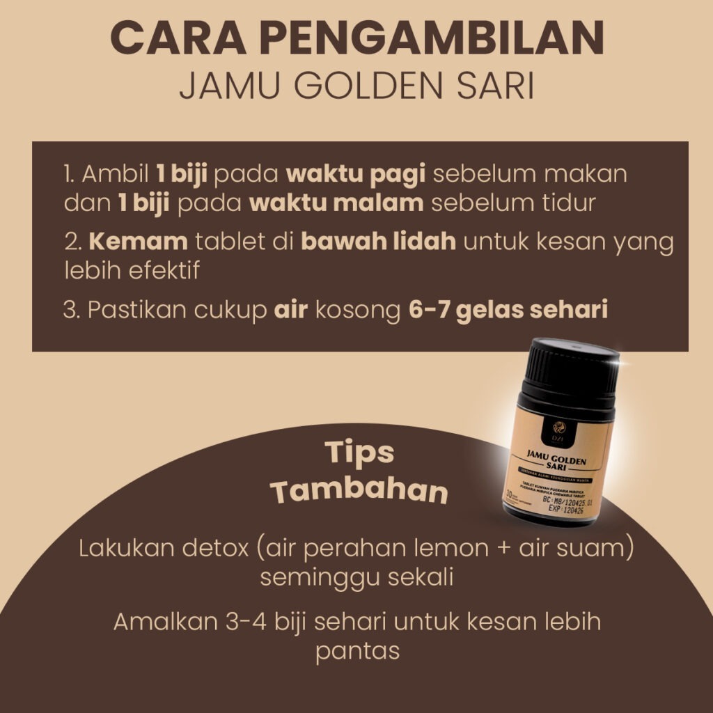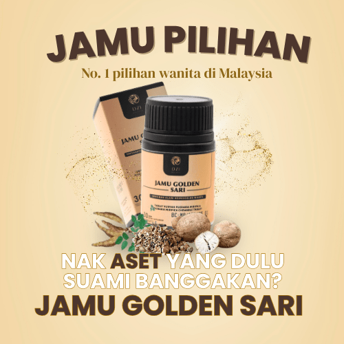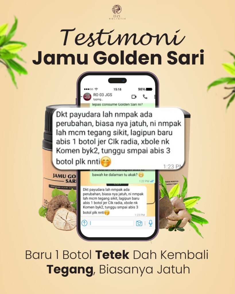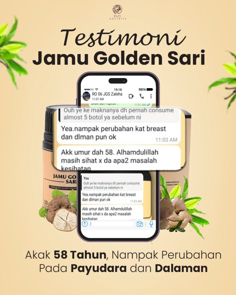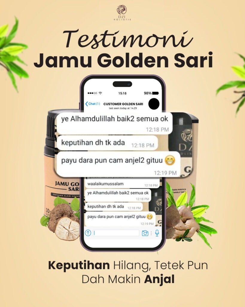 Disclaimer : Jamu Golden Sari adalah suplemen harian berasaskan herba tradisional. Ia tidak bertujuan untuk mendiagnosis, merawat, menyembuhkan atau mencegah sebarang penyakit. Keberkesanan mungkin berbeza mengikut individu. Sila rujuk nasihat pakar kesihatan jika anda mempunyai sebarang masalah kesihatan.
