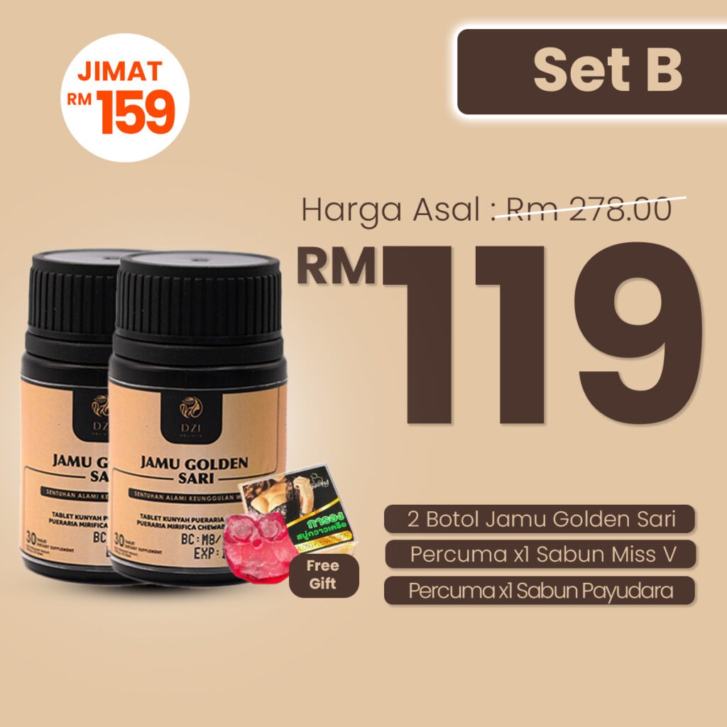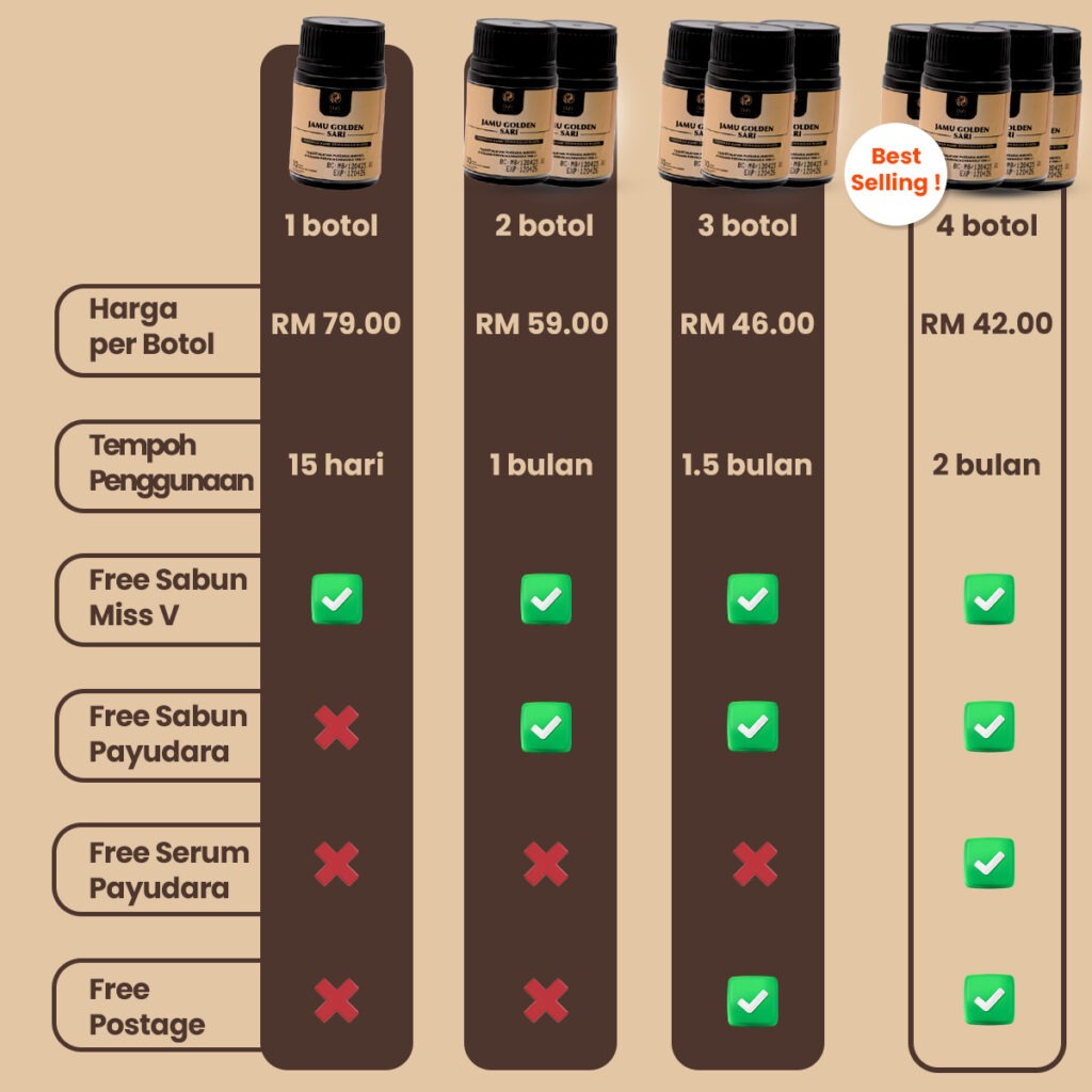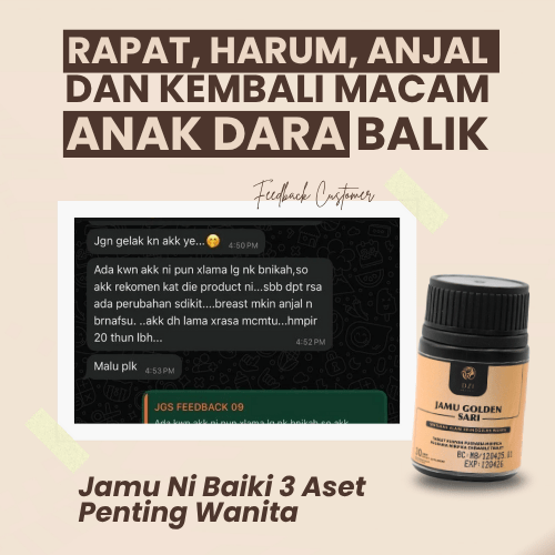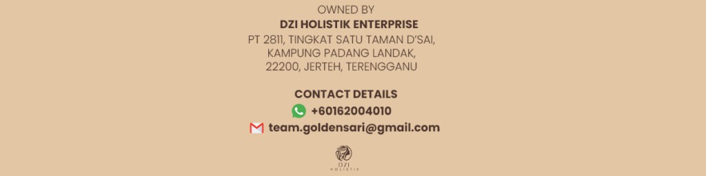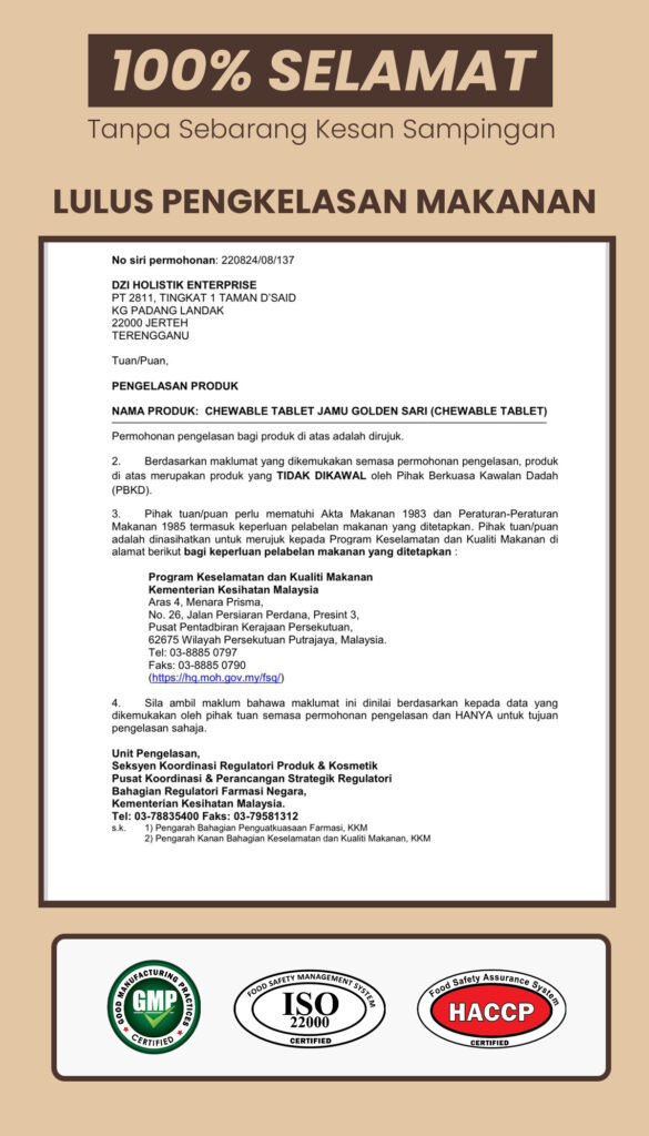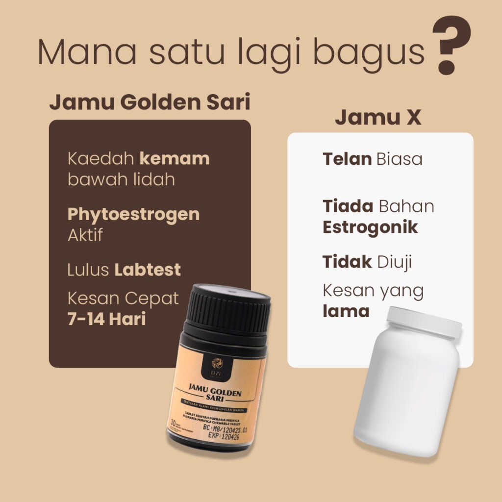 Disclaimer : Jamu Golden Sari adalah suplemen harian berasaskan herba tradisional. Ia tidak bertujuan untuk mendiagnosis, merawat, menyembuhkan atau mencegah sebarang penyakit. Keberkesanan mungkin berbeza mengikut individu. Sila rujuk nasihat pakar kesihatan jika anda mempunyai sebarang masalah kesihatan.