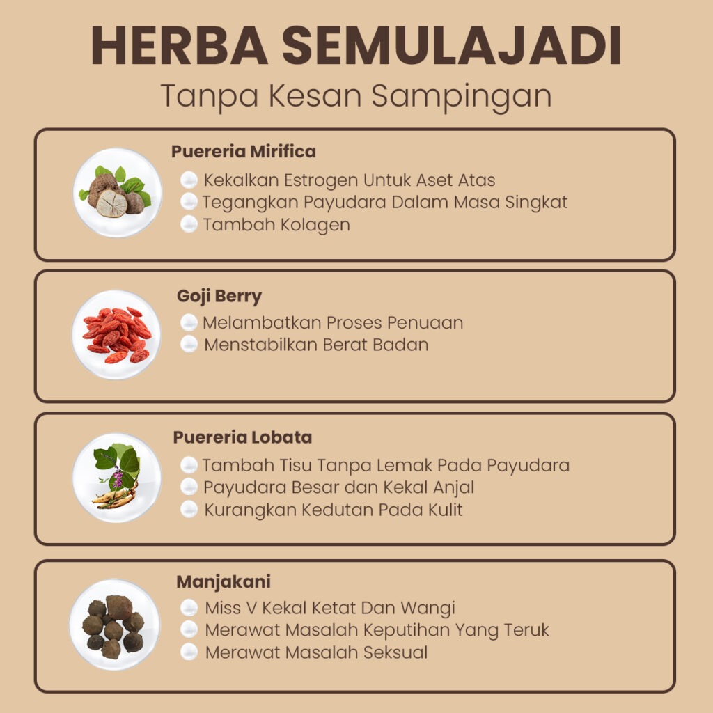 Kesan boleh dirasai seawal 3-7 hari, bergantung kepada hormon dan tindak balas badan setiap individu. Ramai pelanggan kami bagi feedback, aset mereka mula rasa tegang, padat & sedap balik dalam minggu pertama. Untuk kesan optimum, kami sarankan guna konsisten selama 30 hari.